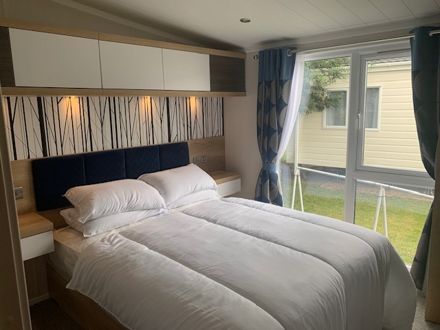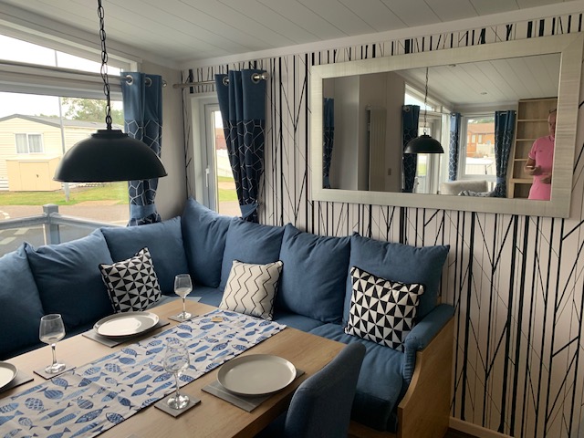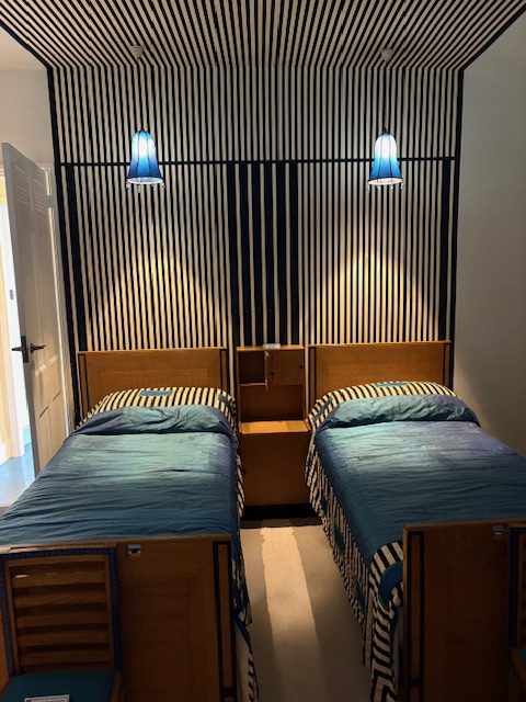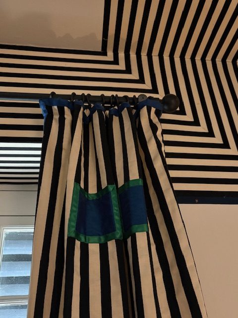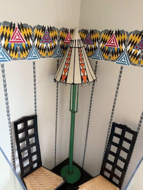 Let me draw your attention to the blue, black, and white Guest Bedroom. When I walked in, I experienced a true moment of life symmetry. My family owns a lodge near the beach that I love, but I’ve always found the decor a bit quirky and not quite my style. However, I’ve grown to appreciate the “modernist” design. Now, I can proudly say it’s inspired by Mackintosh!